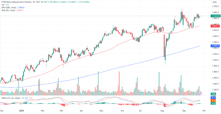 FKLI Sep month rose 7 points or 0.42% to close higher at 1667.5. The FBM KLCI closed higher on Tuesday, boosted by gains in regional markets following China's announcement of extensive stimulus measures to support its economy. Meanwhile, the ringgit reached a three-year high.
