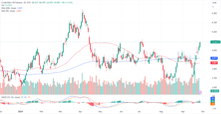 FCPO Dec month contract rose 55 points 1.38% to close higher at 4043. Malaysia's crude palm oil futures maintained their upward trajectory, closing higher for the sixth straight day on Wednesday. Traders attributed this rise to improved export performance and decreased palm oil stocks.