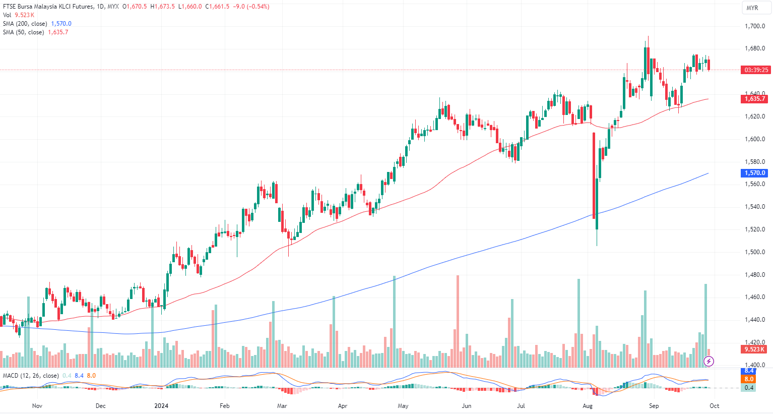 FKLI Sep month dropped 9 points or 0.54% to closed lower at 1661.5 on midday session. Selling pressure on Bursa Malaysia escalated on Friday as investors chose to lock in profits, amid a lack of fresh catalysts to propel the market.