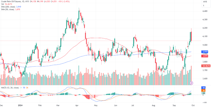 Tracking bearish performance in rival edible oil, palm prices potentially trading lower with technical correction, the crucial support see at 4040 to 4035, breaking below could see further lower, else, we might see buying opportunity at the range. The immediate support and resistance levels are pinpointed at 4040 and 4074, respectively.