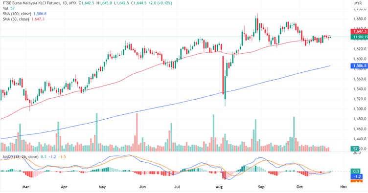 FKLI Oct month dropped 1 points or 0.06% to close slightly lower at 1642.5. The FBM KLCI closed lower on Tuesday, remaining in its consolidation phase due to a lack of buying momentum.