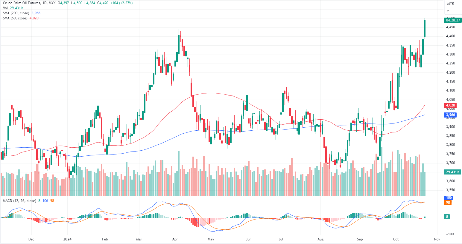 Palm prices supported firmly above 4440 and trading higher to reached the crucial resistant at 4500 range, we might see a further upside if supported above 4495 to 4500, next resistant to see at 4530 to 4535. Else today high price will serve as resistant and likely to see price trading within a consolidation range. Trader may look to buy on retracement. The immediate support and resistance levels are identified at 4458 and 4495, respectively.