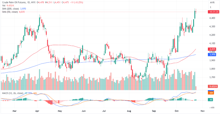 FCPO Jan month contract rose 100 points or 2.28% to close higher at 4486. Malaysia's crude palm oil futures surged to a two-year high, fueled by expectations of reduced production and lower stock levels in both Malaysia and Indonesia. Palm oil traders observed that market sentiment was further bolstered by gains in soybean oil futures on the CBOT exchange.