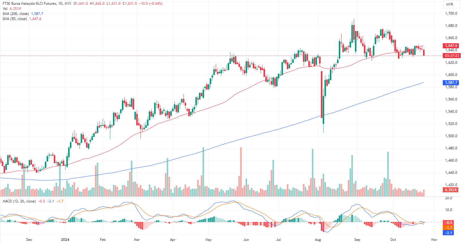 FKLI Oct month dropped 10.5 or 0.64 to closed lower at 1631.5 on midday session. The FBM KLCI extended its decline by midday, reflecting the bearish trend observed across the region.