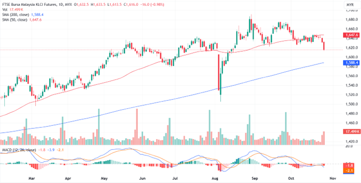 FKLI Oct month dropped 16 points or 0.98% to close lower at 1616. The FBM KLCI a experienced continued selling pressure on Friday, leading to a fifth consecutive decline in the benchmark index.