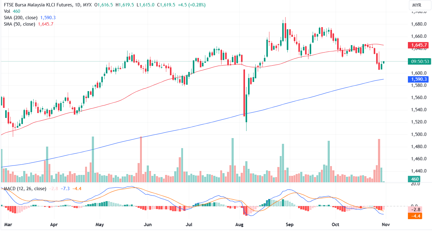 FKLI Nov month rose 8.5 points or 0.53% to close higher at 1618.5. The FBM KLCI closed higher on Tuesday as bargain-hunting activity picked up after six consecutive days of decline.