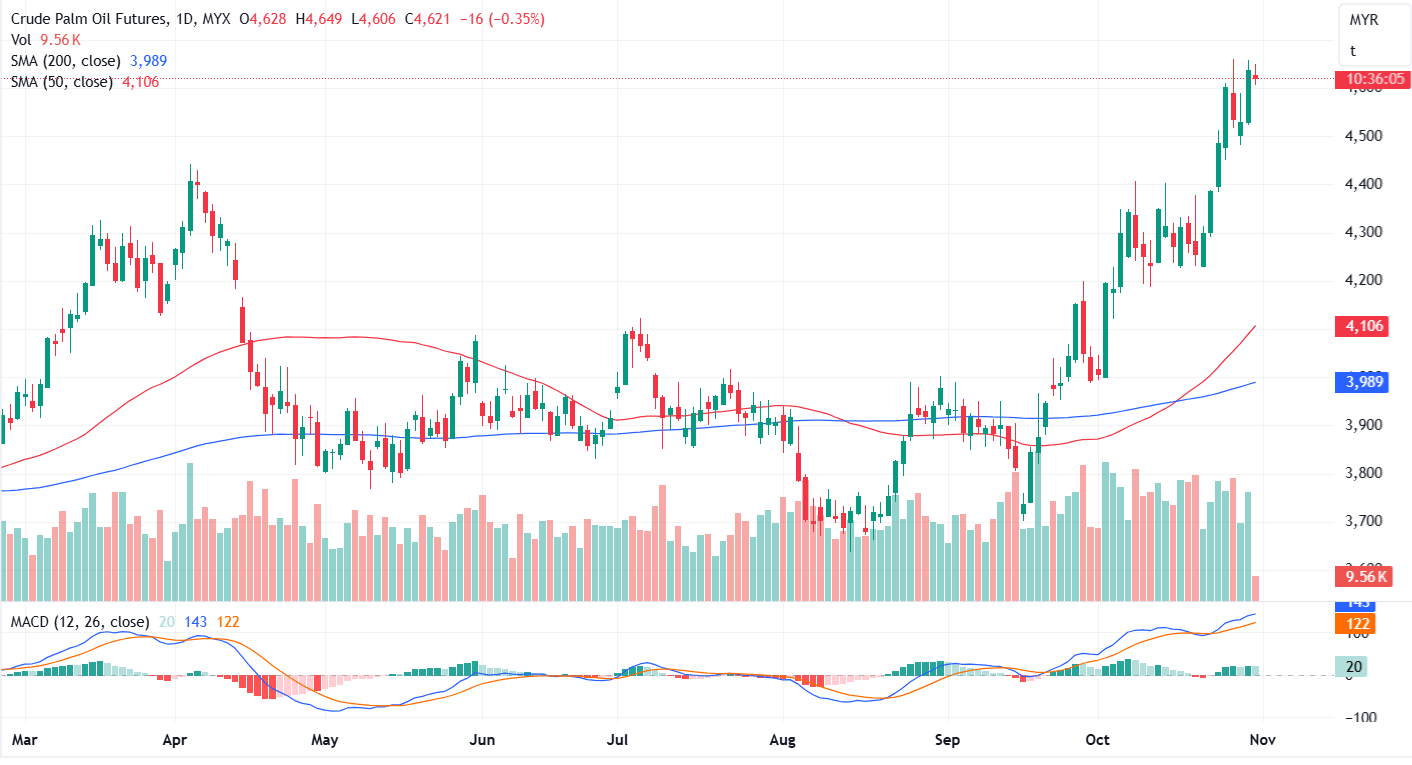FCPO Jan month contract rose 108 points or 2.38% to close higher at 4637. Malaysia's crude palm oil futures closed higher on Tuesday, reaching a two-year peak. Market analysts attributed the increase to bullish sentiment, strong export performance, and a stable production outlook for October.