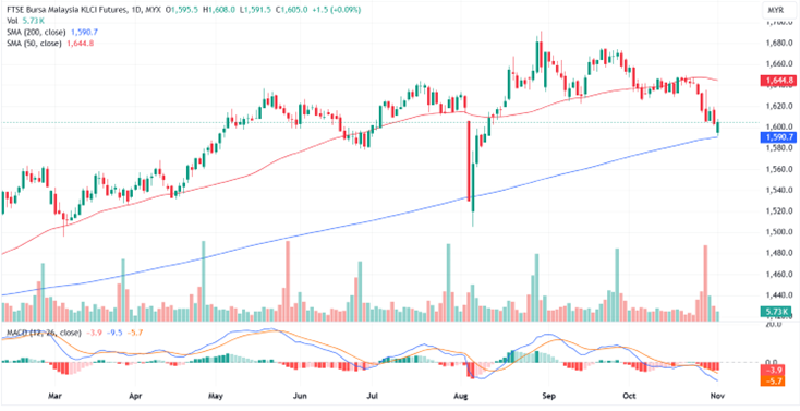 FKLI Nov month rose 1.5 points or 0.09% to close higher at 1605. The FBM A surge in plantation stocks, particularly SD Guthrie, driven by a rise in crude palm oil (CPO) prices to a new 28-month high, helped push Bursa Malaysia’s benchmark index above the crucial psychological support level of 1,600 on Friday.