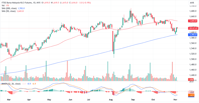 FKLI Nov month rose 14 points or 0.87% to close higher at 1619. The FBM KLCI ended the Monday session higher, with equities rebounding from last week's decline. However, investors remained cautious ahead of the U.S. presidential election and the Federal Reserve's upcoming decision on interest rates.