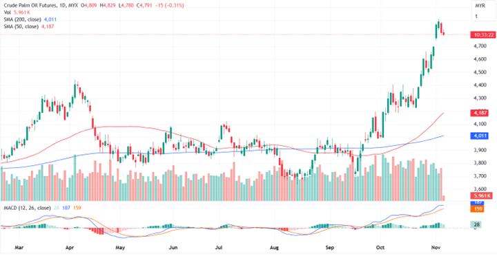 Tracking bearish performance in rival oil market, the palm prices could trade lower on further technical correction, if breaking below 4780 to 4775 could see further lower. The immediate support and resistance levels are pinpointed at 4782 and 4821, respectively.