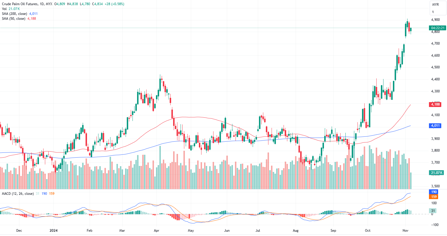 FCPO Jan month rose 28 points or 0.58% to closed higher at 4834 on midday session. Malaysian crude palm oil futures edged up on Wednesday midday session, supported by weaker ringgit and anticipation of slower output.
