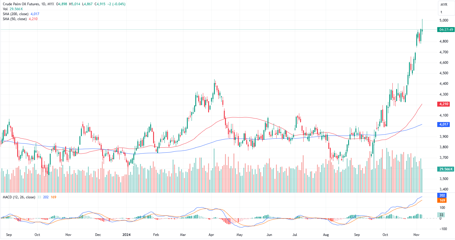 FCPO Jan month dropped 2 points or 0.04% to closed slightly lower at 4915 on midday session. Malaysia's crude palm oil futures closed higher on Wednesday, with the actively traded contract rising above RM4,900 per tonne. Palm oil traders attributed the positive market sentiment to a stronger export pace and a weaker ringgit against the US dollar.
