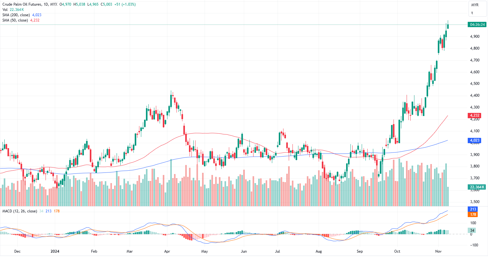 FCPO Jan month rose 51 points or 1.03% to closed higher at 5003 on midday session. Malaysia's crude palm oil futures closed higher on Thursday, driven by a weaker production outlook in the country. Palm oil traders noted that stronger-than-expected demand, coupled with Indonesia's plans to raise its biofuel mandate, further boosted market sentiment.