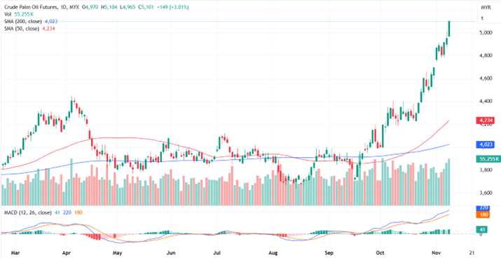 FCPO Jan month contract rose 149 points or 3.01% to close higher at 5101. Malaysian crude palm oil futures rose for a third consecutive week on Friday, buoyed by projections on palm oil production and prices for 2024-2025 presented at a major industry conference in Bali.