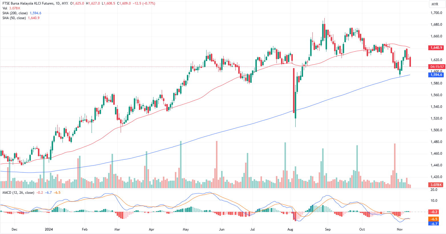 FKLI Nov month dropped 12.5 points or 0.77% to closed lower at 1609 on midday session. The FBM KLCI opened positively but encountered profit-taking by midday, reaching a low for the morning as investors adopted a more cautious stance.