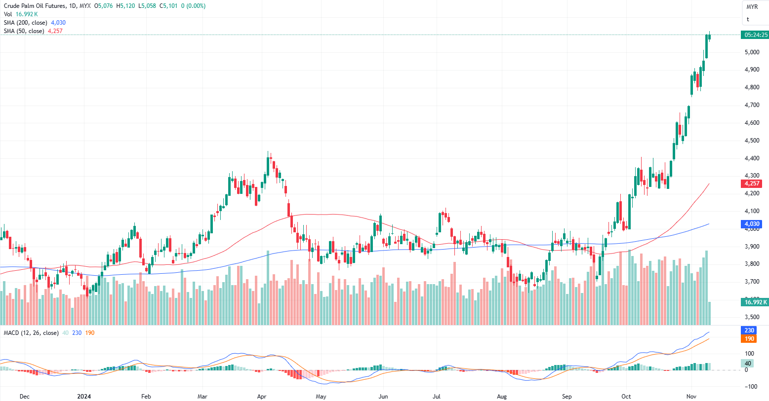 FCPO Jan month closed flat at 5101 on midday session. Malaysian crude palm oil futures rose for a third consecutive week on Friday, buoyed by projections on palm oil production and prices for 2024-2025 presented at a major industry conference in Bali.