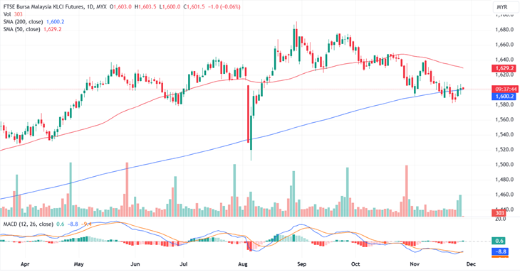 FKLI Nov month rose 1.5 or 0.09% to close higher at 1602.5. The FBM KLCI trimmed some of its gains but stayed above the 1,600-point psychological level, supported by the stability of index-linked stocks.