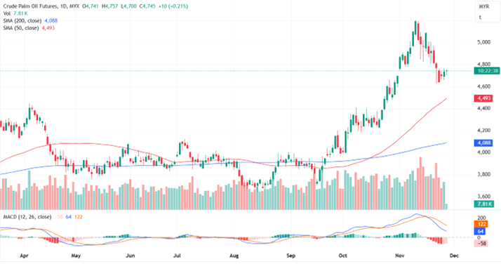 Tracking the positive performance in rival oil market, the palm price likely to remain trading within a sideway consolidation with upward bias, as it supported above the middle of the range at 4700 to 4710. Breaking above 4755 to 4760 range could see further higher to next resistant. The immediate support and resistance levels are pinpointed at 4734 and 4756, respectively.
