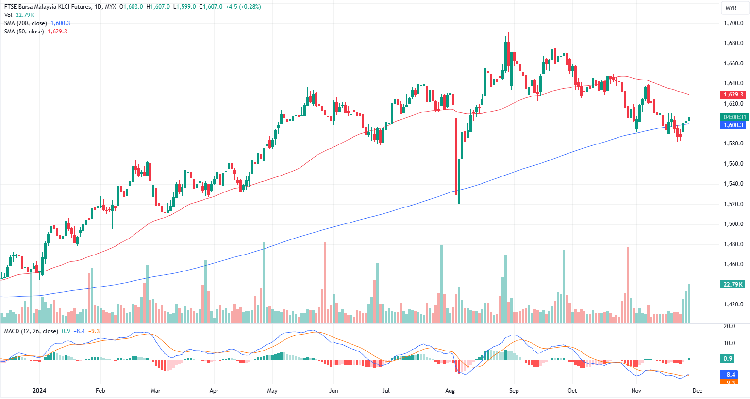 FKLI Nov month rose 4.5 points 0.28% to closed higher at 1607 on midday session. The FBM KLCI dipped slightly at the opening of Wednesday's trading session but held firm above the key psychological level of 1,600 points.