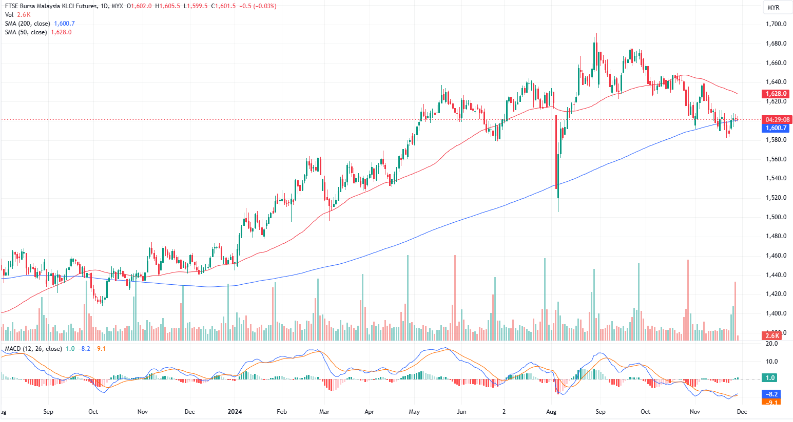 FKLI Nov month dropped 0.5 points 0.03% to closed almost flat at 1601.5 on midday session. The FBM KLCI opened higher on Thursday as investors continued buying stocks following a wave of corporate earnings announcements.