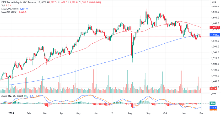 FKLI Dec month closed flat to end at 1595. The FBM KLCI closed lower on Friday as investors stayed on the sidelines amidst mixed trading across the region.
