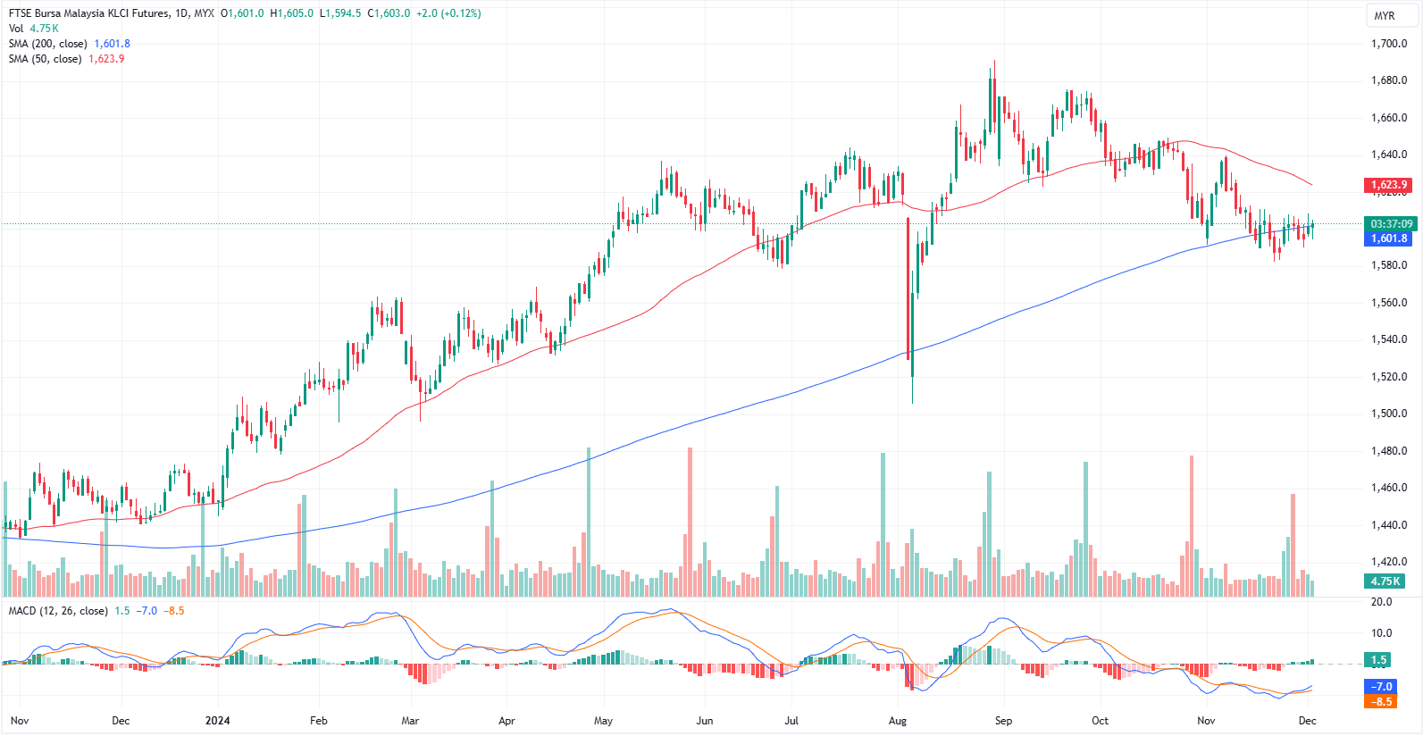FKLI Nov month rose 2 points 0.12% to closed higher at 1603 on midday session. The FBM KLCI remained in the lead heading into the lunch break, aligning with the positive momentum seen across regional markets.