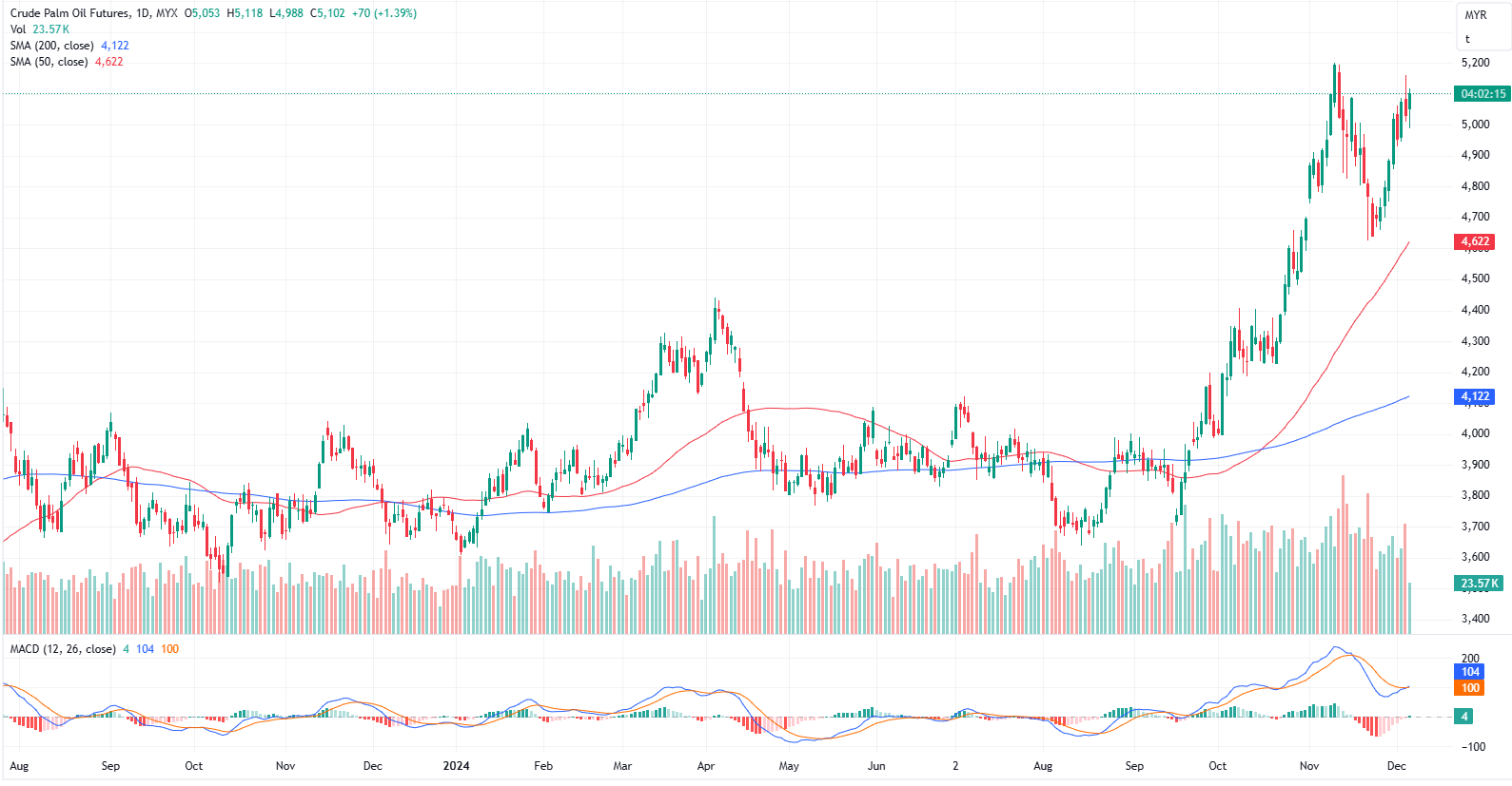 FCPO Feb month rose 70 points or 1.39% to closed higher at 5102 on midday session. Malaysian crude palm oil futures traded within a narrow range on Thursday, pressured by weakness in Dalian palm oil contracts and expectations of lower November stock levels in Malaysia, the world's second-largest palm oil exporter.