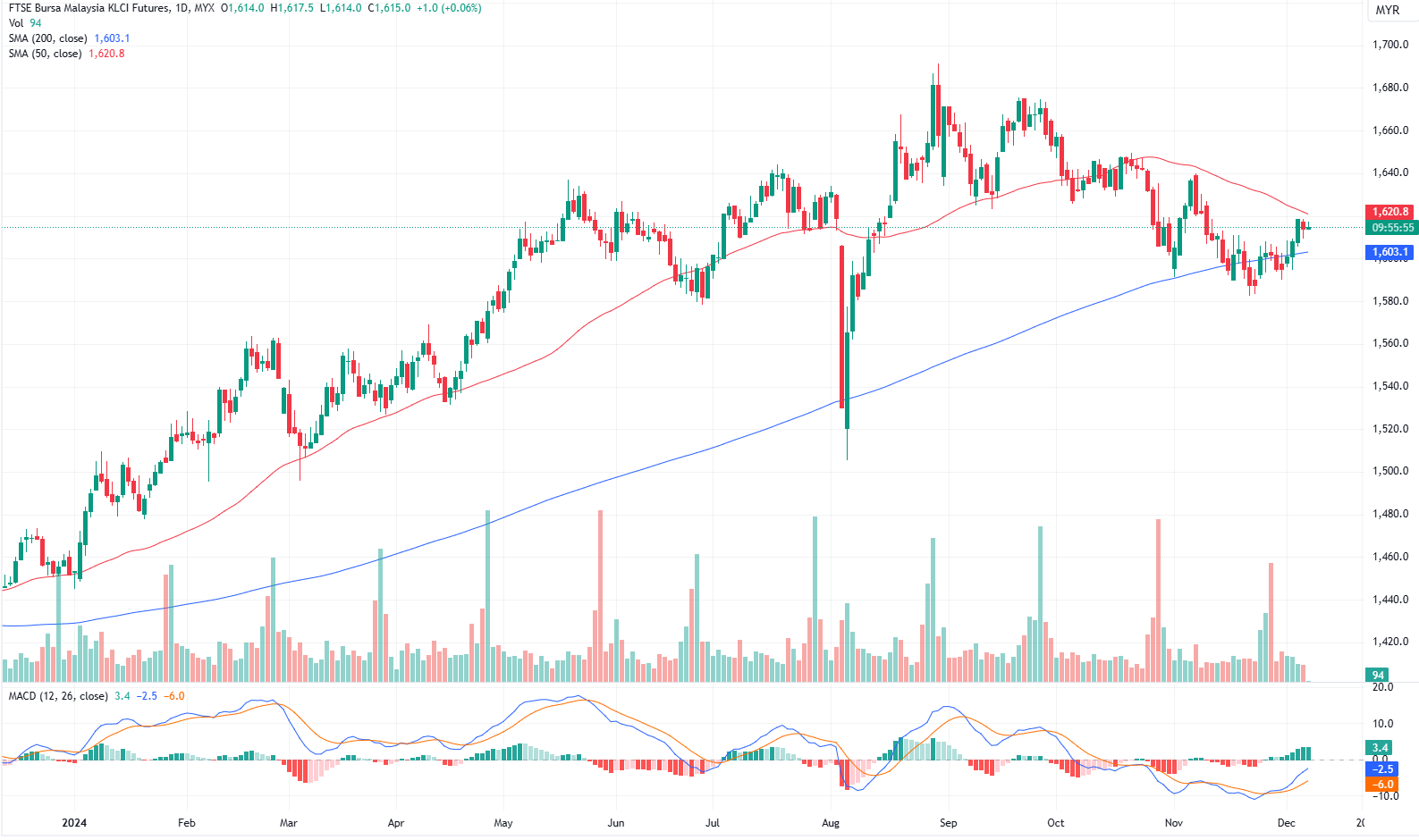 FKLI Dec month dropped 4.5 points or 0.28% to closed lower at 1614. The FBM KLCI ended higher on Thursday, supported by gains in financial services and healthcare heavyweights.