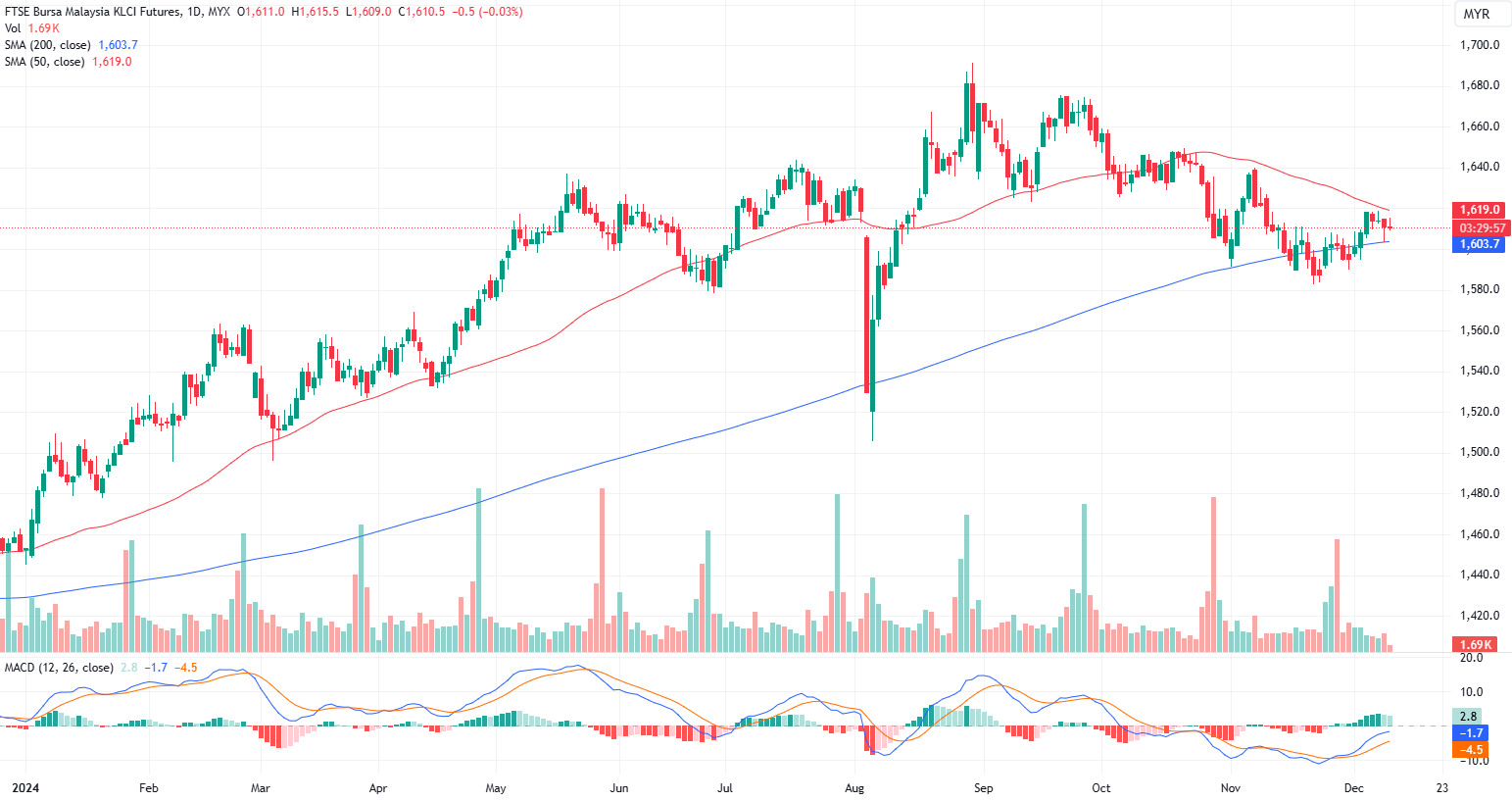 FKLI Dec month dropped 0.5 points or 0.03% to closed lower at 1610.5 on midday session. Malaysia's main stock index faced selling pressure in the early session, reinforcing the ongoing consolidation in the local market.