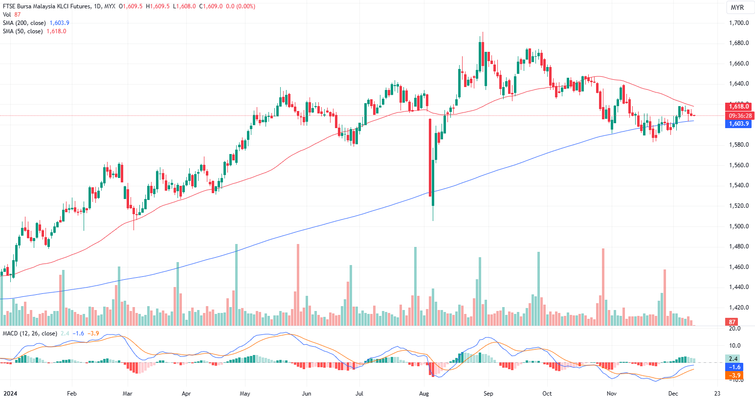 FKLI Dec month dropped 2.0 points or 0.12% to closed lower at 1609. Bursa Malaysia closed lower on Tuesday in thin trading, with volume dipping below three billion shares, as weak Wall Street performance and investor caution ahead of key U.S. inflation data weighed on sentiment ahead of the Dec 18 rate cut decision.