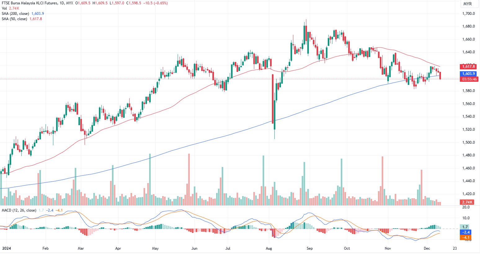 FKLI Dec month dropped 10.5 points or 0.65% to closed lower at 1598.5 on midday session. The FBM KLCI closed the morning session near the crucial 1,600 support level as profit-taking intensified ahead of a key U.S. inflation report due tonight.