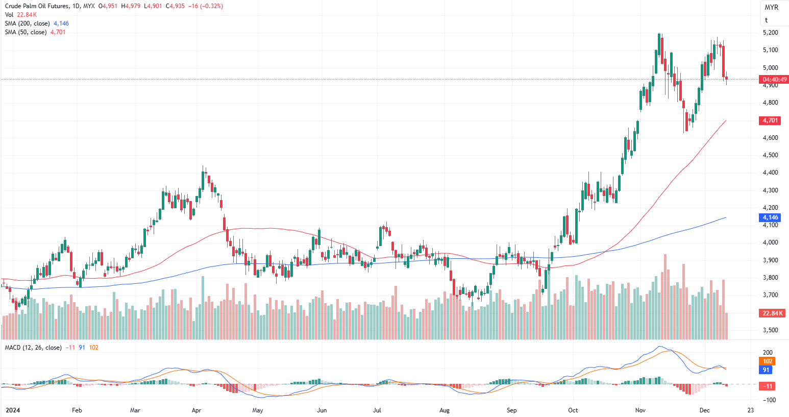 FCPO Feb month dropped 16 points or 0.32% to closed lower at 4938 on midday session. Malaysian crude palm oil futures ended lower on Tuesday following industry regulator data revealing declines in the country's stockpiles, production, and exports.