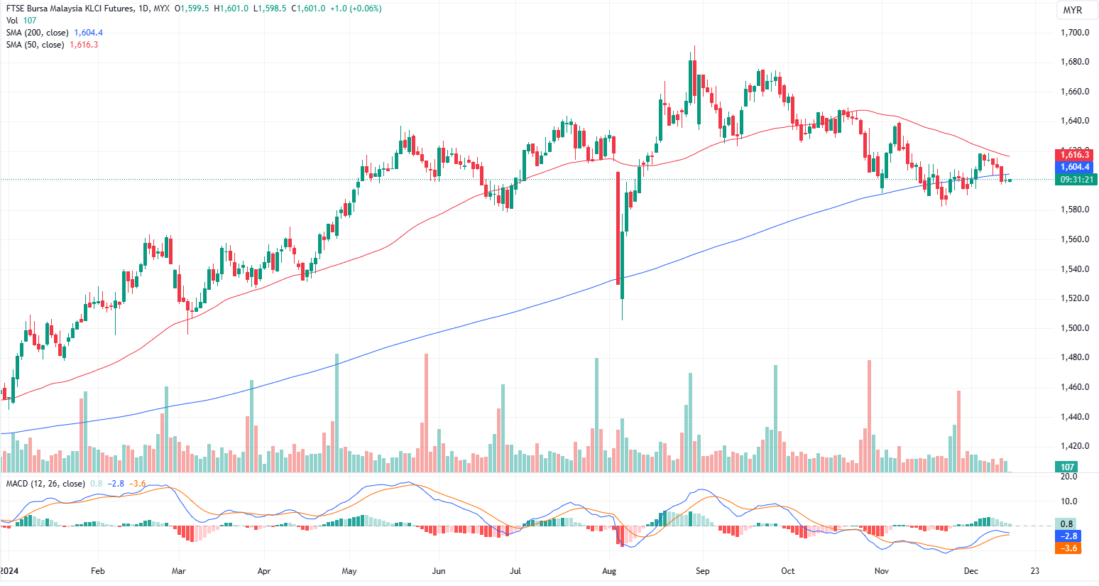 FKLI Dec month rose 0.5 points or 0.03% to closed almost flat at 1600. The FBM KLCI index faced challenges in sustaining its positive momentum throughout the day, ultimately closing slightly lower due to late selling pressure, despite the upbeat performance of regional markets.