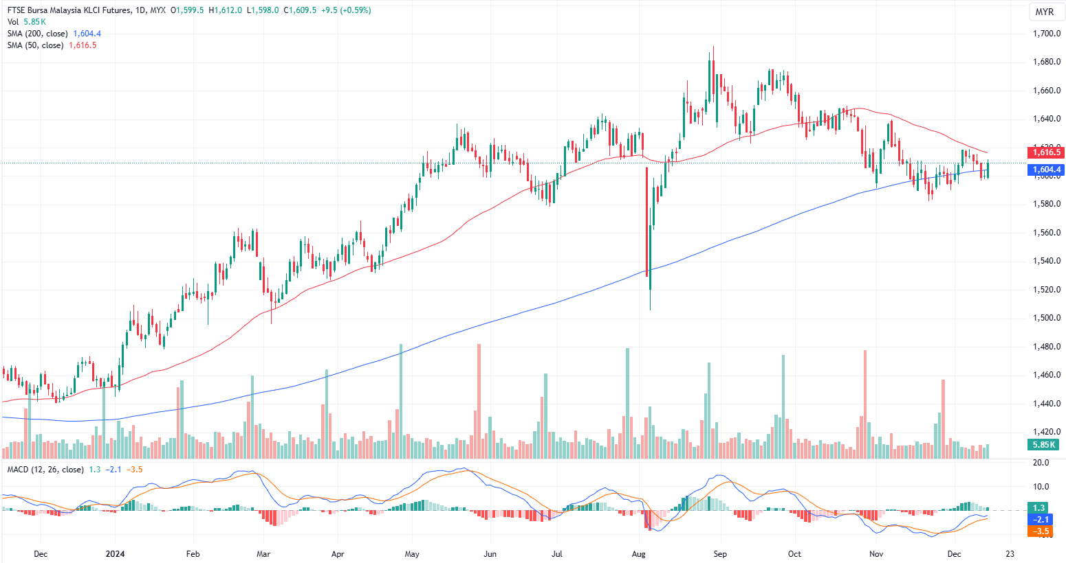 FKLI Dec month rose 9.5 points or 0.59% to closed higher at 1609.5. The FBM KLCI remained positive during the early session, poised to break a five-day losing streak despite a regional market slump, amid expectations that U.S. rate cuts may slow in the coming year.