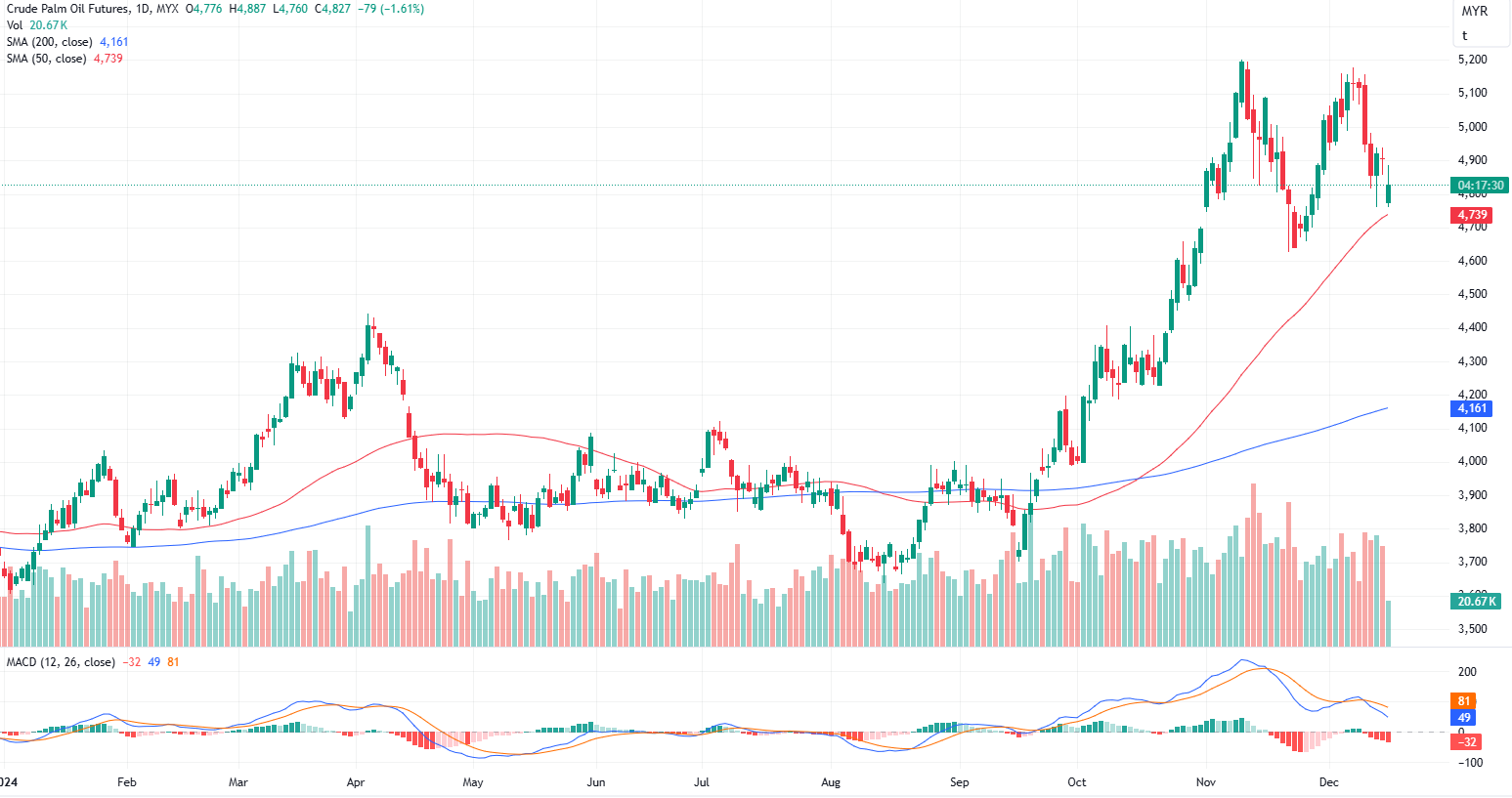 The FCPO contract trading on Mar25 contract from today onward. Palm prices open lower and trading higher on morning session, forming a wide range sideway consolidation with the bottom spotted at 4760 to 4770, latest trading below the middle of the range 4845 to 4850, serve as first resistant range, while support at 4810 to 4800, if the price could support above the range, we might see further higher, toward the first resistant range. If the p[rice fail to support, we might see selling pressure to continue. The immediate support and resistance levels are identified at 4823 and 4845, respectively.
