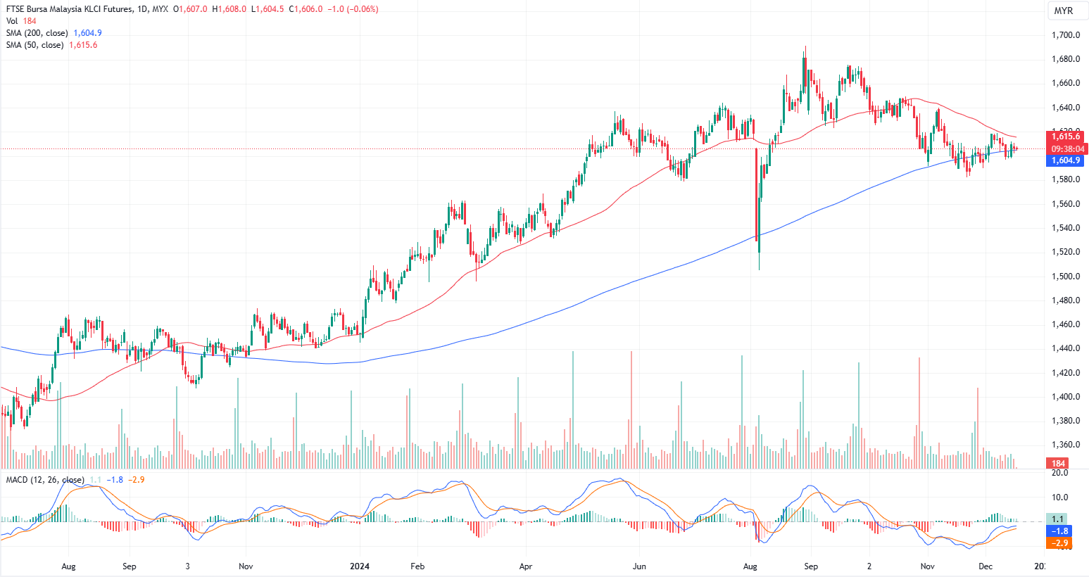 FKLI Dec month dropped 2.5 points or 0.16% to closed lower at 1607. The FBM KLCI closed lower on Monday, weighed down by index-linked banking stocks amid softness in regional markets.