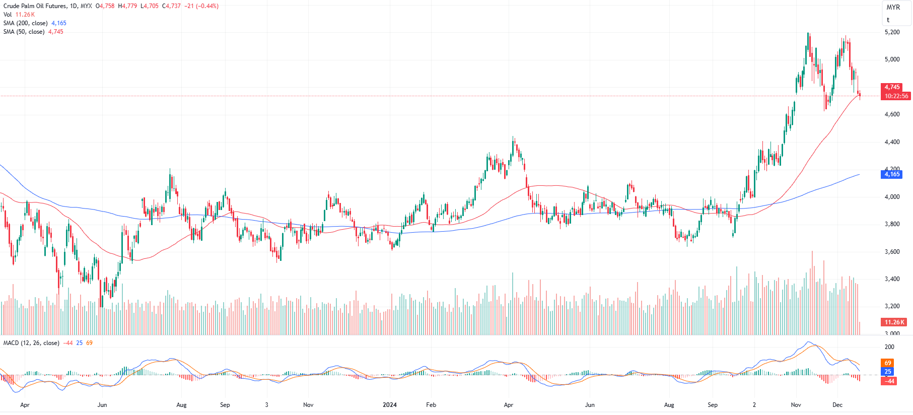 FCPO Mar month contract dropped 148 points or 3.02% to close lower at 4758. Malaysian crude palm oil futures fell for a second consecutive session on Monday, reversing midday gains due to declines in rival soyoils, though a weaker ringgit helped cushion the losses.