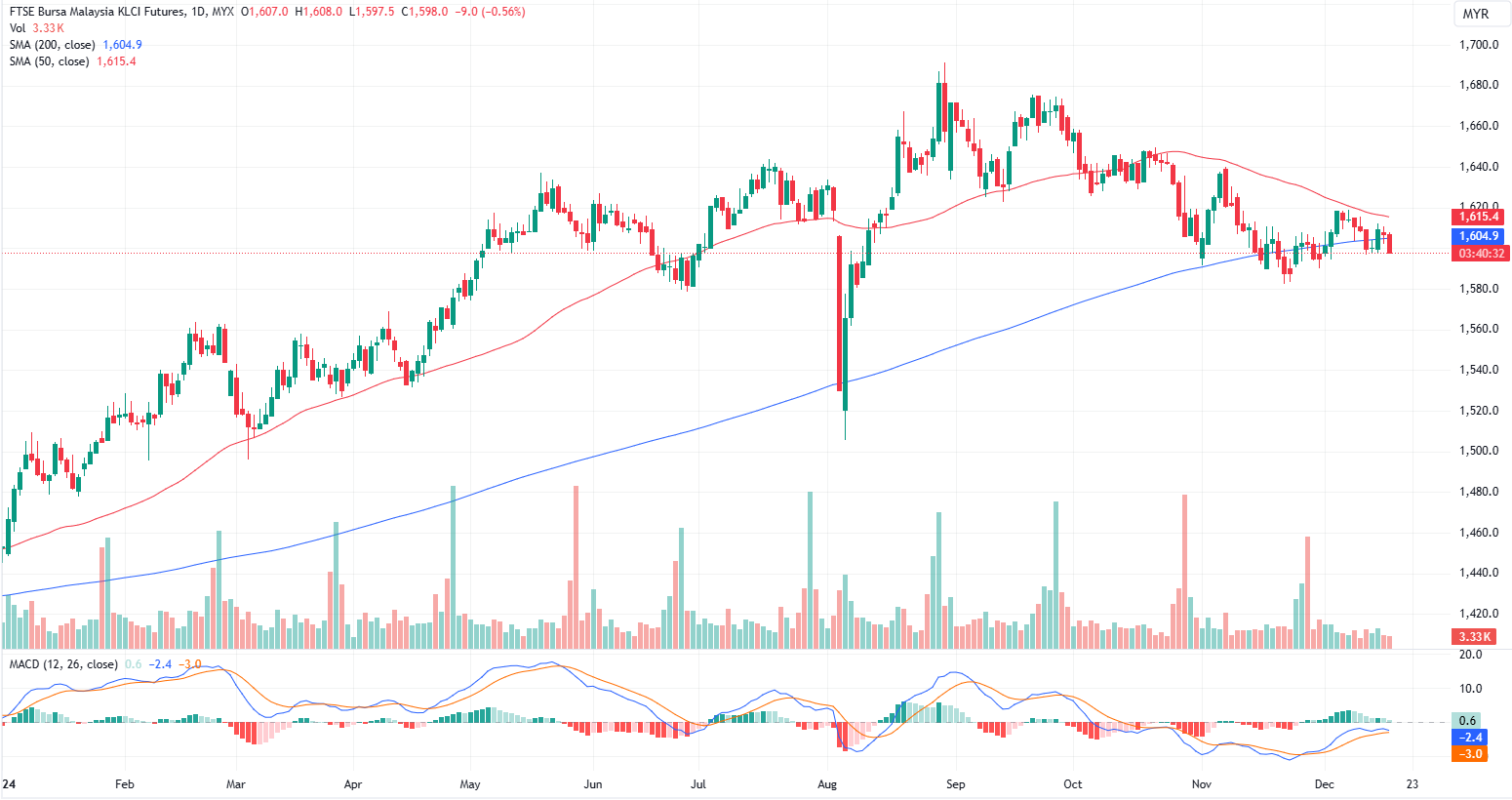 FKLI Dec month dropped 9 points or 0.56% to closed lower at 1598 on midday session. The FBM KLCI stayed in negative territory at midday amid cautious sentiment, with investors closely monitoring the US central bank's outlook for clues on the interest rate path in 2025.