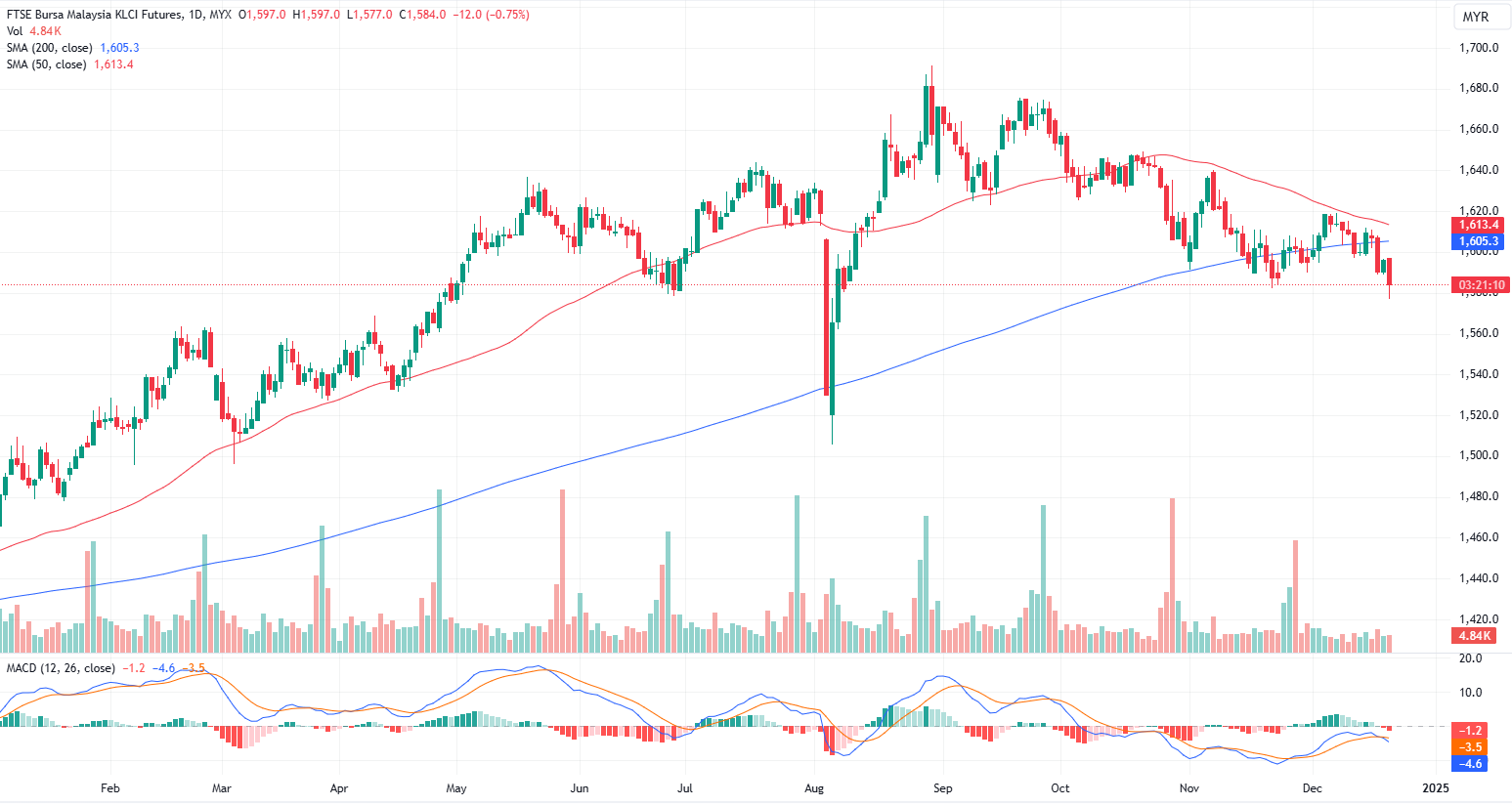 FKLI Dec month rose 3.5 points or 0.22% to closed higher at 1594 on midday session. The FBM KLCI stayed broadly lower at midday, weighed down by weak market sentiment and selling in index-linked counters, along with declines in regional markets.