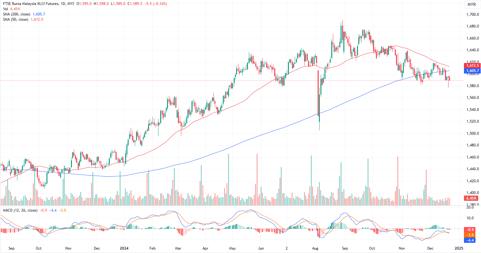 FKLI Dec month dropped 5.5 point or 5.5% to closed lower 1589.5. The FBM KLCI ended lower on Friday, weighed down by persistent selling pressure and mirroring trends in regional markets.