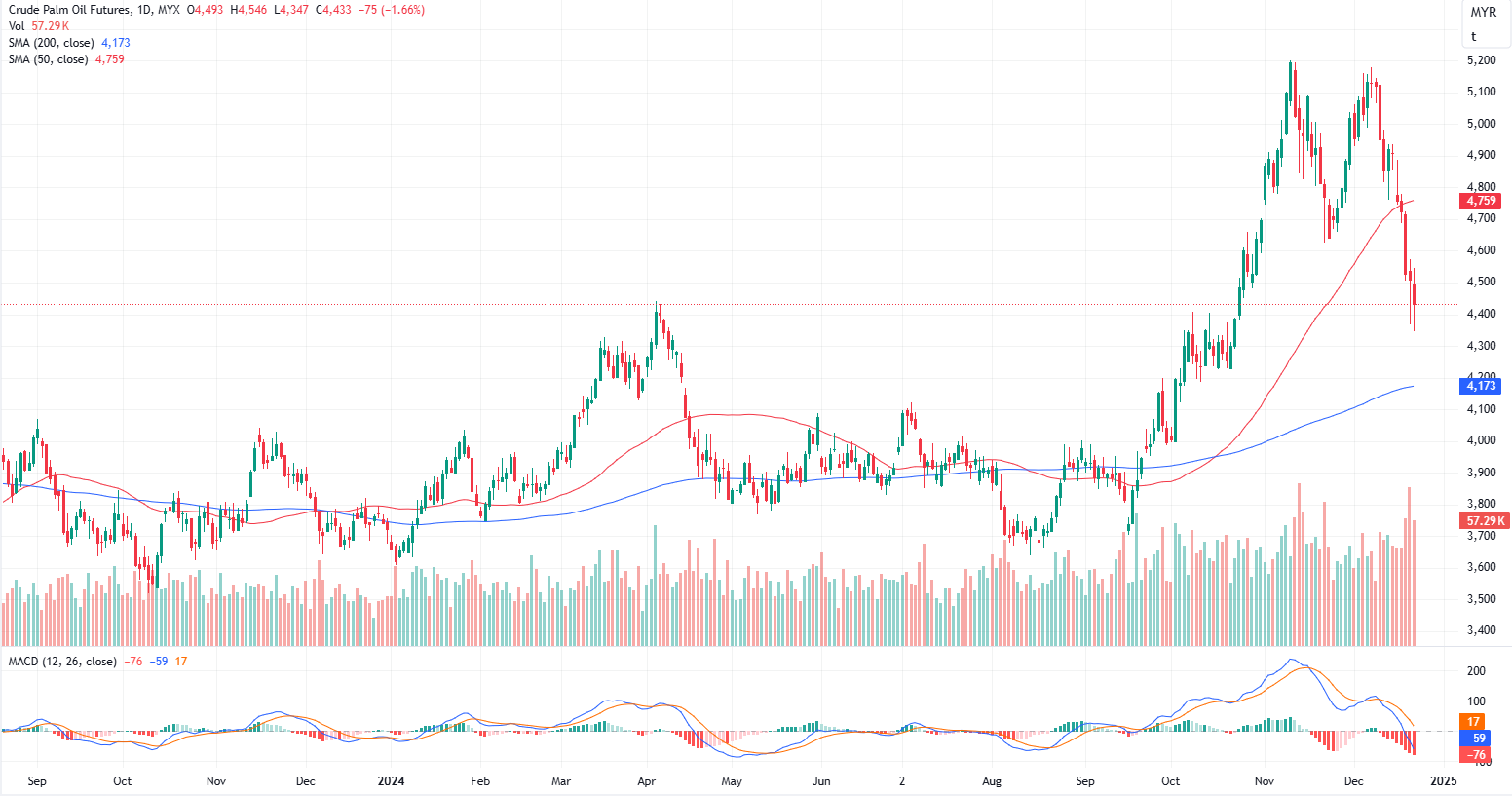 FCPO Mar month contract dropped 71 points or 1.66% to closed lower at 4433. Malaysian crude palm oil futures closed lower on Friday, marking a second consecutive weekly decline due to weak export demand.