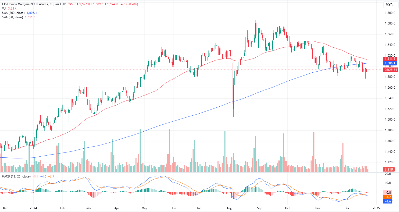FKLI Dec month rose 4.5 points or 0.28% to closed higher at 1594 on midday session. The FBM KLCI inched up at Monday midday, driven by gains in banking stocks, despite cautious investor sentiment.