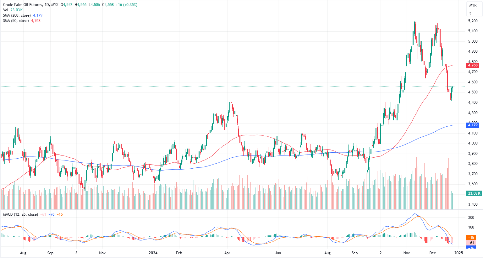 FCPO Mar month contract rose 16 points or 0.35% to closed higher at 4558. Malaysian crude palm oil futures moved sideways on Tuesday, with profit-taking limiting gains ahead of the Christmas holiday.