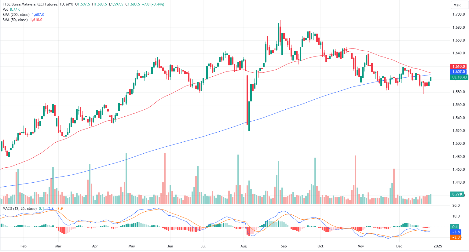 FKLI Dec month rose 7 points or 0.44% to closed higher at 1603.5 on midday session. The FBM KLCI climbed at midday on Boxing Day, driven by year-end window dressing activities amid a subdued market.