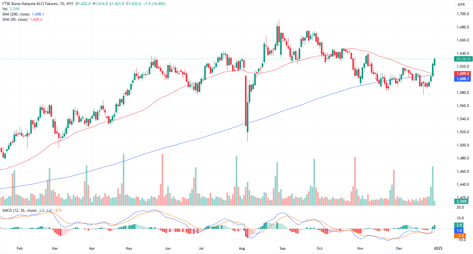 FKLI Dec month rose 7.5 points or 0.46% to closed higher at 1632 on midday session. The FBM KLCI rebounded after a soft opening, reinforcing optimism that the year-end rally will extend through the final two trading days.