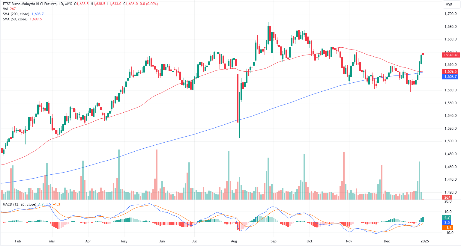 FKLI Jan month rose 13 point or 0.80% to closed higher 1639. The FBM KLCI closed the penultimate trading day of the year on a positive note, rebounding from a weak start as buying momentum in selected heavyweights, including Maybank and Petronas Chemicals, gained traction amid year-end window dressing by local institutions.