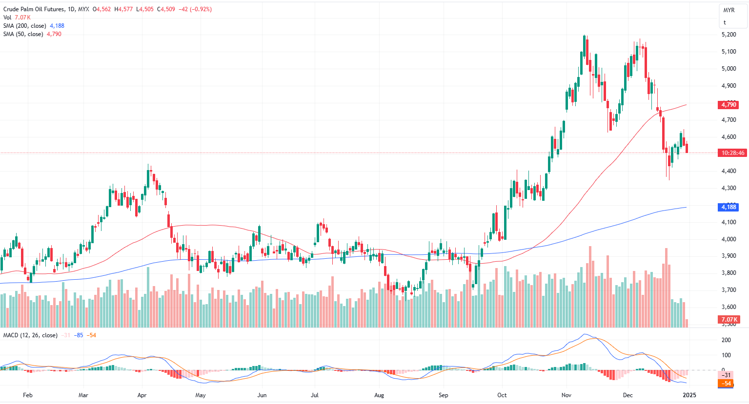 FCPO Mar month contract dropped 73 points or 1.58% to closed lower at 4551. Malaysian crude palm oil futures continued to decline on Monday, tracking losses in rival soyoils on the Dalian market, as traders awaited fresh catalysts amid the holiday season.