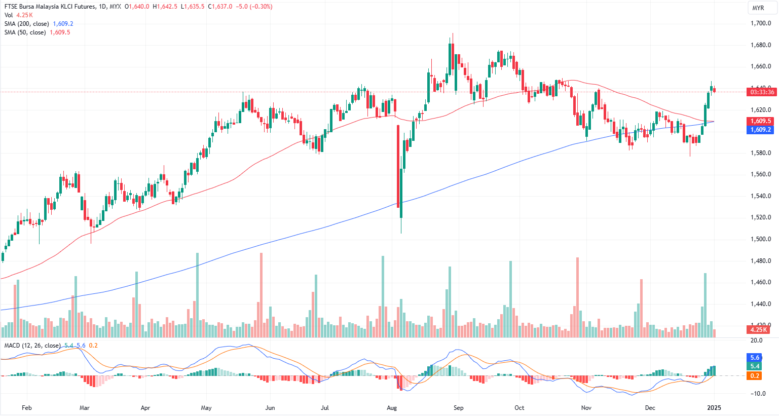 FKLI Jan month dropped 3 points or 0.30% to closed lower at 1637 on midday session. The benchmark FBM KLCI opened the new year on a weak note, falling over 10 points amid profit-taking activities, as cautious sentiment dominated regional markets. Concerns over the anticipated return of Donald Trump to the White House contributed to a subdued start for most Asian indices, which began 2025 in the red.
