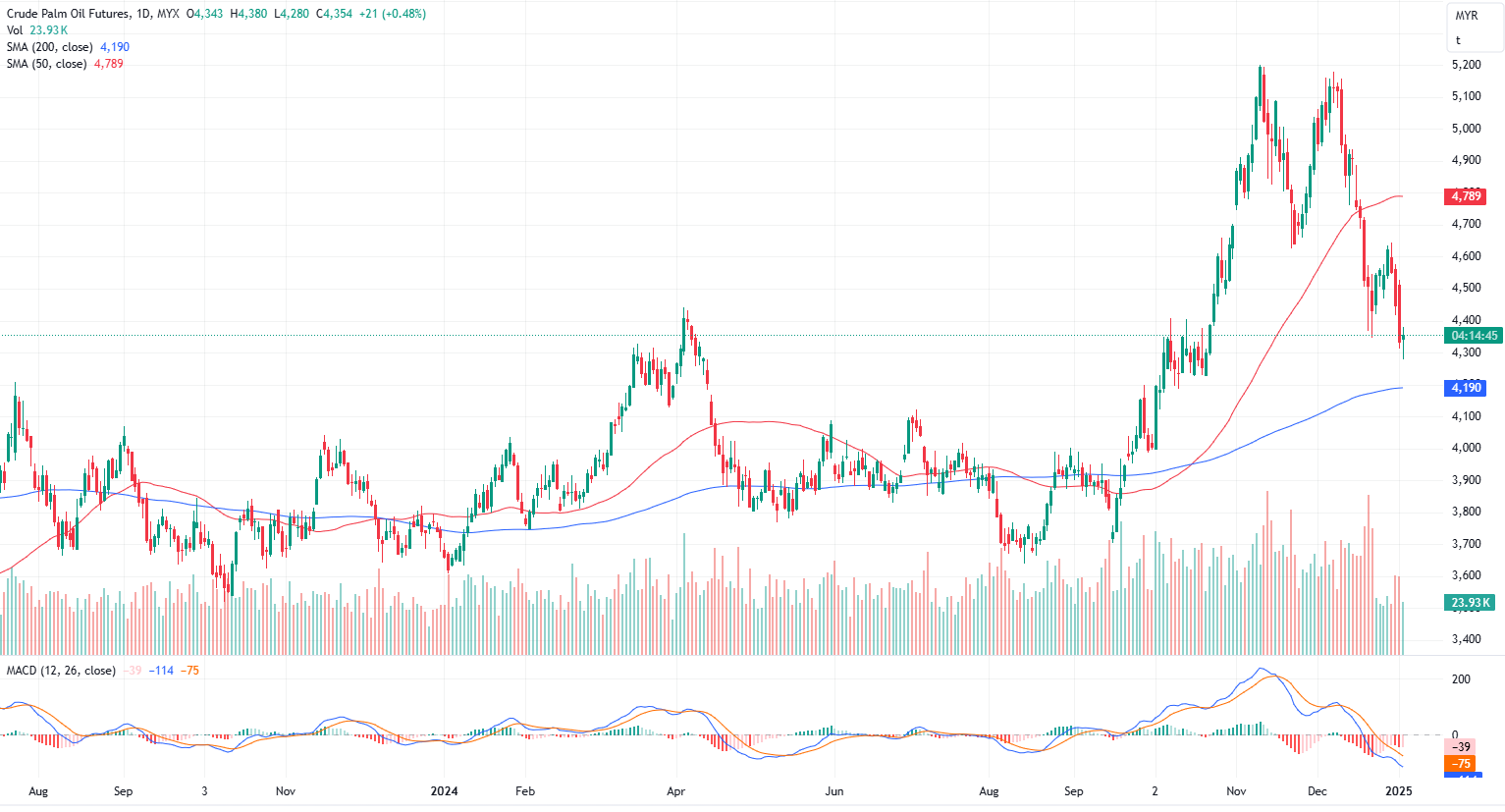 FCPO Mar month rose 21 points or 0.48% to closed higher at 4354 on midday session. Malaysian crude palm oil futures opened lower on Friday, following weakness in rival Dalian vegetable oils, and were on track for a weekly decline.