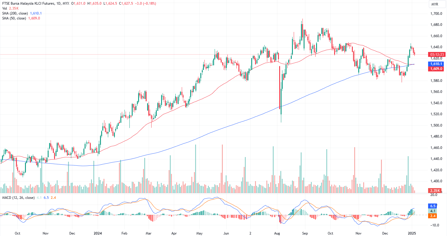 FKLI Jan month dropped 3 points or 0.18% to closed lower at 1627.5 on midday session. The domestic market surrendered early gains as investors took profit, anticipating further foreign outflows amid a strengthening US dollar. By noon closing, the benchmark FBM KLCI had declined 3.89 points to 1,625.57, with bank stocks reversing earlier advances to trade in negative territory.
